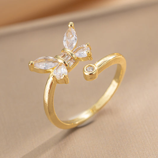 Detalhes: Anel ajustável com design de borboleta e zircônias cravejadas.