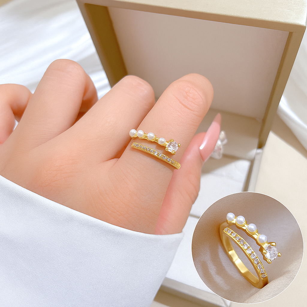 Descubra o equilíbrio perfeito entre o clássico e o moderno com o nosso deslumbrante Anel Duo de Elegância. Esta joia é a representação perfeita da harmonia, com um design delicado e sofisticado que une a pureza das pérolas com o brilho dos cristais.