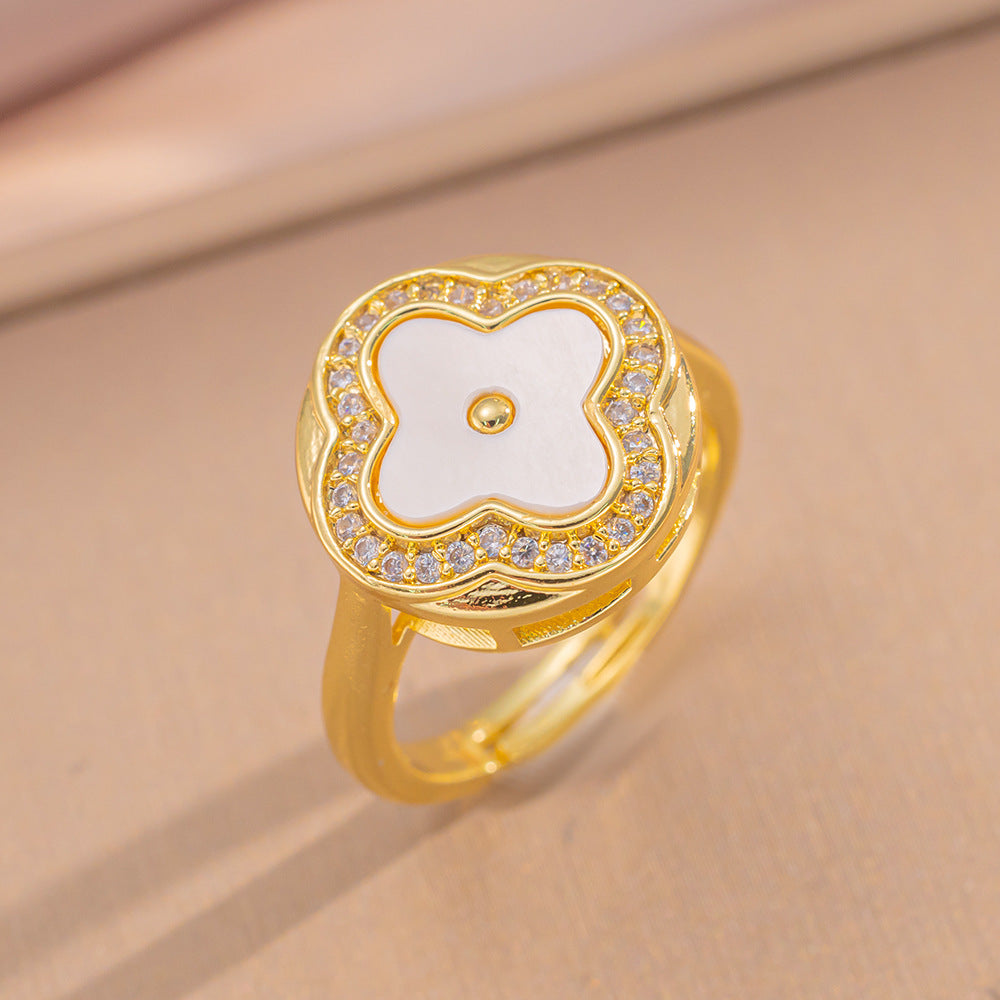 • Detalhes: Anel ajustável com design de trevo, madrepérola e zircônias cravejadas.