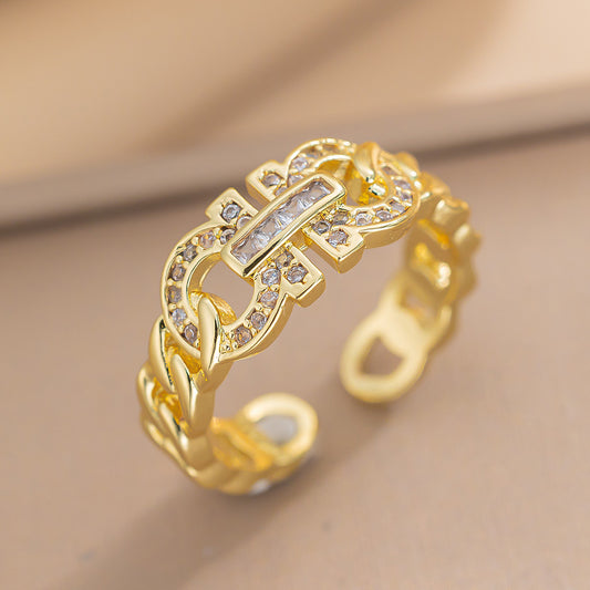 Detalhes: Anel ajustável, com design de fivela e corrente e zircônias cravejadas.