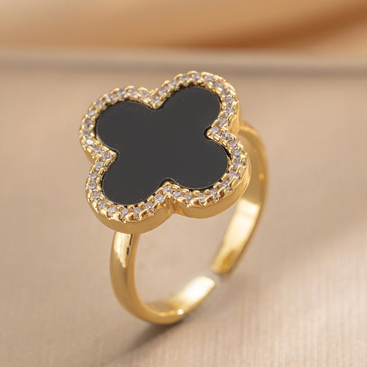 Detalhes: Anel ajustável com design de trevo, madrepérola e ônix preto, e zircônias cravejadas.