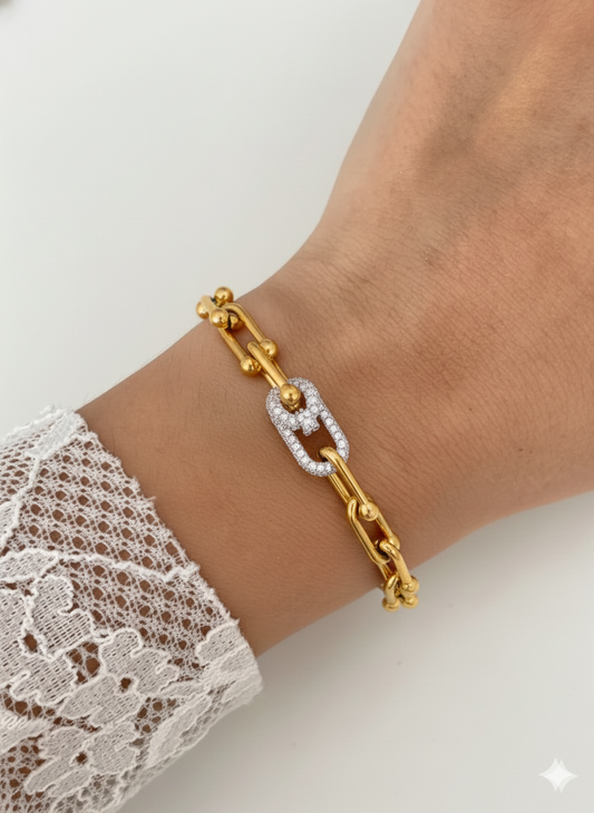 Confeccionada em Aço Inoxidável com um luxuoso banho de Ouro 18K, a pulseira garante durabilidade excepcional, resistência à água e o brilho intenso do dourado. Seu design é moderno e cativante, composto por elos em formato de U (paper clip) intercalados por pequenas esferas douradas. O destaque fica por conta do elo central, ricamente cravejado com um pavê de zircônias cintilantes, criando um ponto focal de glamour.