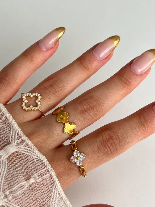 Confeccionado em Aço Inoxidável com um luxuoso banho de Ouro 18K, o anel garante durabilidade excepcional, resistência à água e o brilho intenso do dourado. O destaque fica por conta do seu design vazado e ajustável, composto por uma sequência de motivos de trevo de quatro folhas. O contraste entre os trevos lisos e polidos e os que possuem uma textura em alto-relevo adiciona profundidade e um charme único.