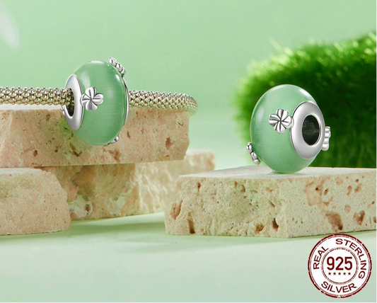 As laterais em prata são adornadas com delicados trevos de quatro folhas, que simbolizam a boa sorte e a fortuna. Este berloque é mais do que um acessório; ele é um amuleto para te lembrar de que a sorte está sempre do seu lado.