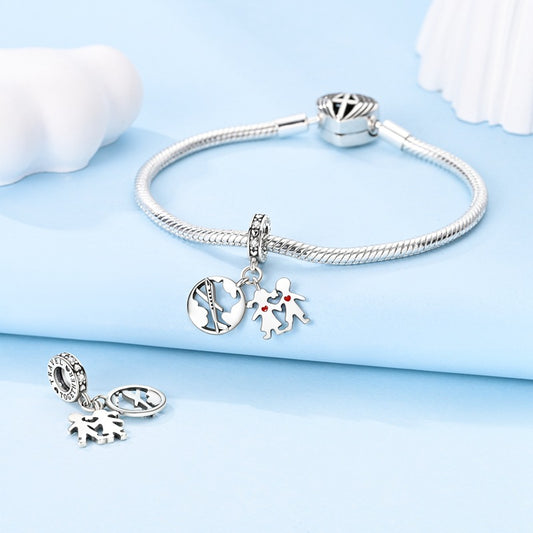Feito em Prata 925 autêntica, este berloque pendente é um símbolo do laço especial que conecta a família. Ele traz duas figuras de mãos dadas, com pequenos corações em esmalte vermelho, e um globo com um avião, que representa as jornadas compartilhadas.