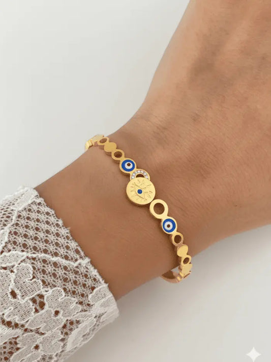 Confeccionado em Aço Inoxidável com um luxuoso banho de Ouro 18K, o bracelete garante durabilidade excepcional, resistência à água e o brilho intenso do dourado. Seu design é moderno e elegante, com o aro semi-aberto adornado por uma sequência de motivos circulares. O destaque fica por conta do amuleto central de Sol (com o Olho Turco esmaltado no centro) e dos pequenos Olhos Turcos esmaltados em azul e branco, que se intercalam com círculos polidos.