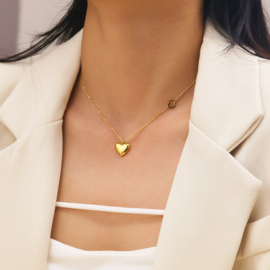 Confeccionado em Aço Inoxidável com um luxuoso banho de Ouro 18K, o colar garante durabilidade excepcional, resistência à água e o brilho intenso do dourado. O destaque fica por conta do pingente de coração volumoso e polido, que serve como peça central. O design minimalista é complementado por um pequeno coração vazado que adorna a corrente na altura do ombro, adicionando um toque sutil e charmoso.