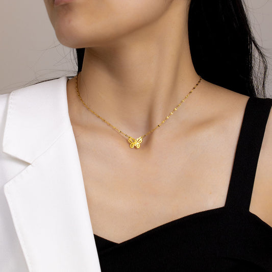 Confeccionado em Aço Inoxidável com um luxuoso banho de Ouro 18K, o colar garante durabilidade excepcional, resistência à água e o brilho intenso do dourado. O destaque fica por conta do pingente de borboleta vazada, com um design elegante e simétrico que repousa delicadamente no colo. As asas em formato vazado transmitem a leveza do voo, tornando a peça um charme discreto e marcante.