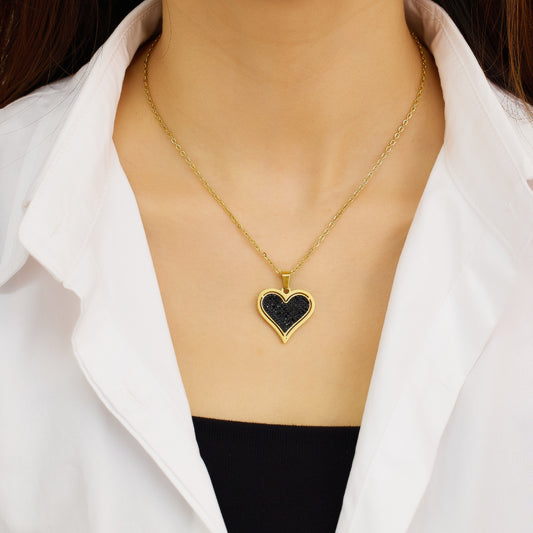 Confeccionado em Aço Inoxidável com um luxuoso banho de Ouro 18K, o colar garante durabilidade excepcional, resistência à água e o brilho intenso do dourado. O destaque fica por conta do pingente de coração volumoso, com o centro ricamente coberto por um pavê de zircônias negras (ou ônix). O contraste do preto profundo com a moldura dourada polida confere à peça um visual statement, moderno e cheio de atitude.