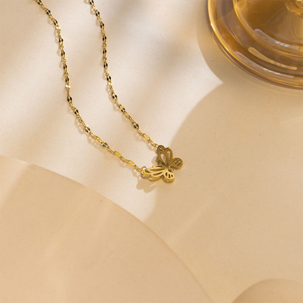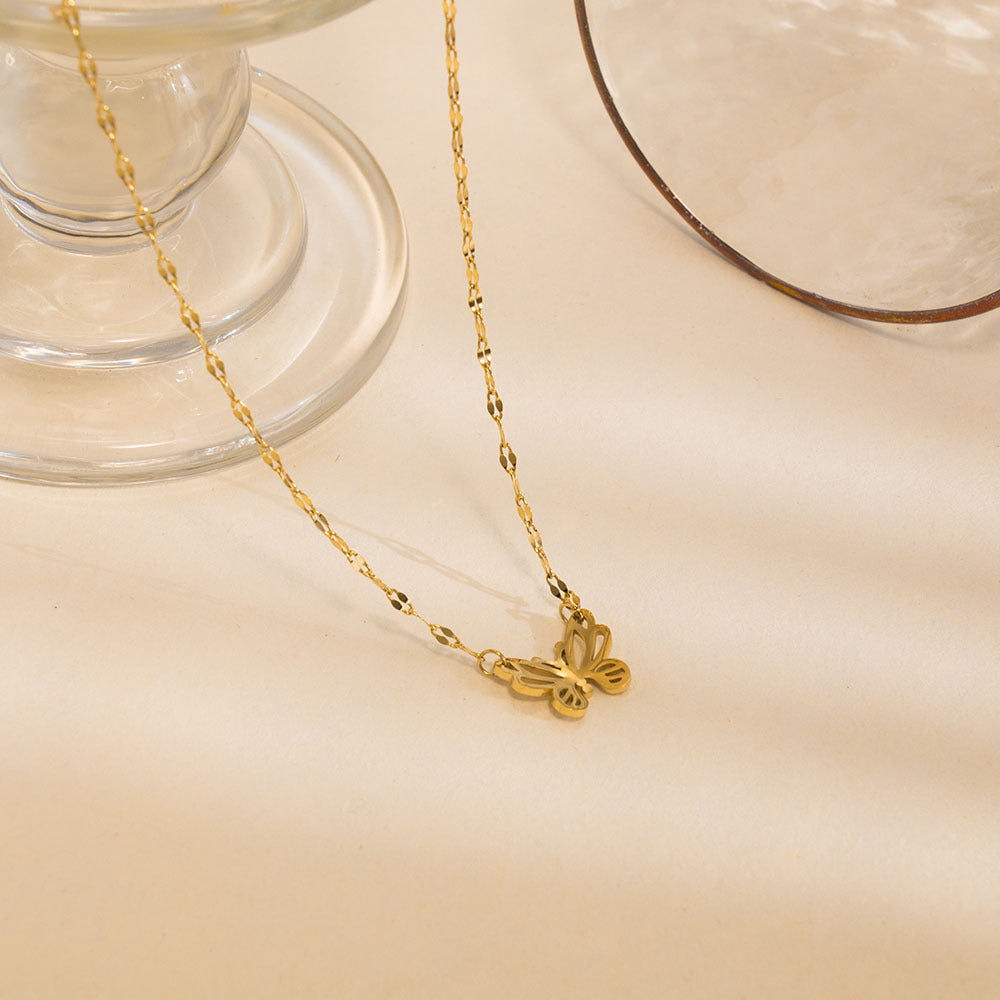 Confeccionado em Aço Inoxidável com um luxuoso banho de Ouro 18K, o colar garante durabilidade excepcional, resistência à água e o brilho intenso do dourado. O destaque fica por conta do pingente de borboleta vazada, com um design elegante e simétrico que repousa delicadamente no colo. As asas em formato vazado transmitem a leveza do voo, tornando a peça um charme discreto e marcante.