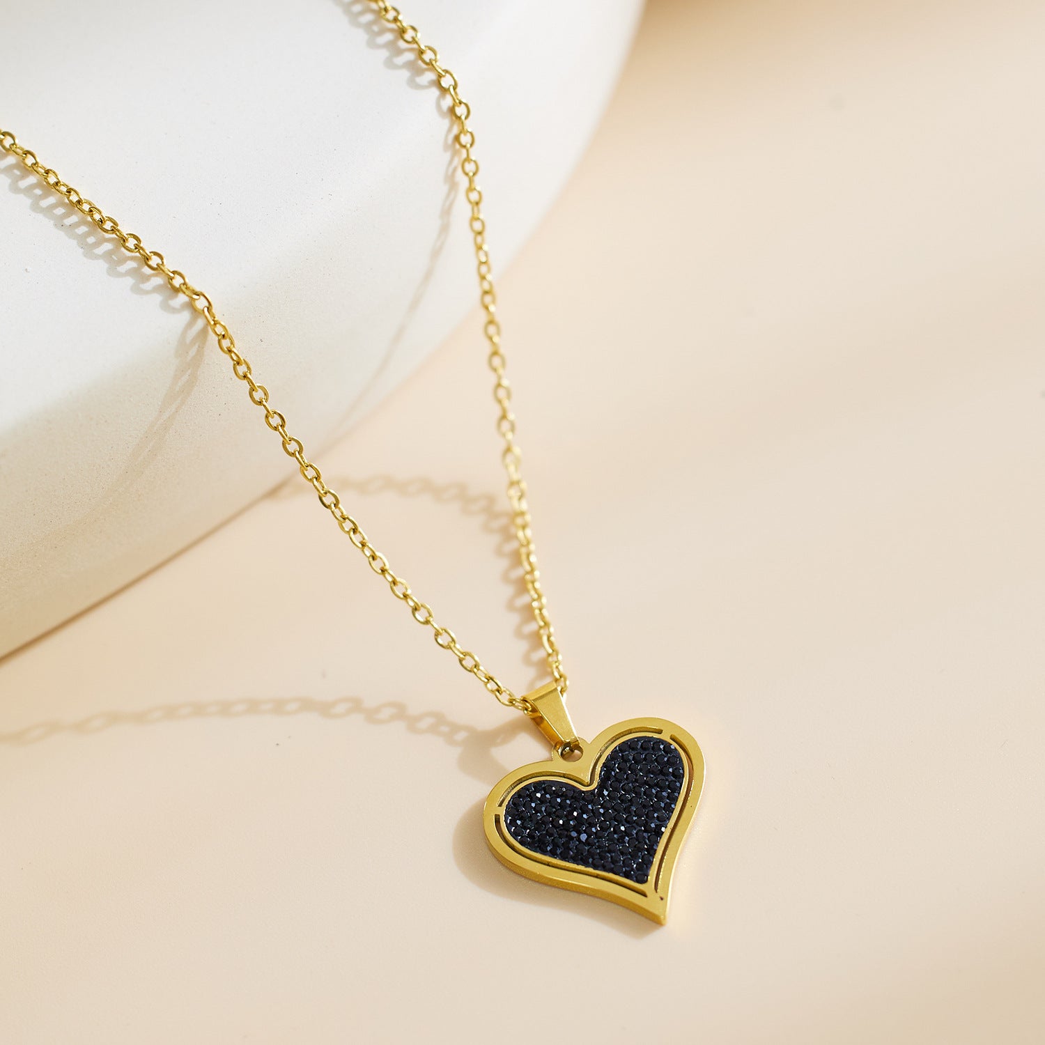 Confeccionado em Aço Inoxidável com um luxuoso banho de Ouro 18K, o colar garante durabilidade excepcional, resistência à água e o brilho intenso do dourado. O destaque fica por conta do pingente de coração volumoso, com o centro ricamente coberto por um pavê de zircônias negras (ou ônix). O contraste do preto profundo com a moldura dourada polida confere à peça um visual statement, moderno e cheio de atitude.