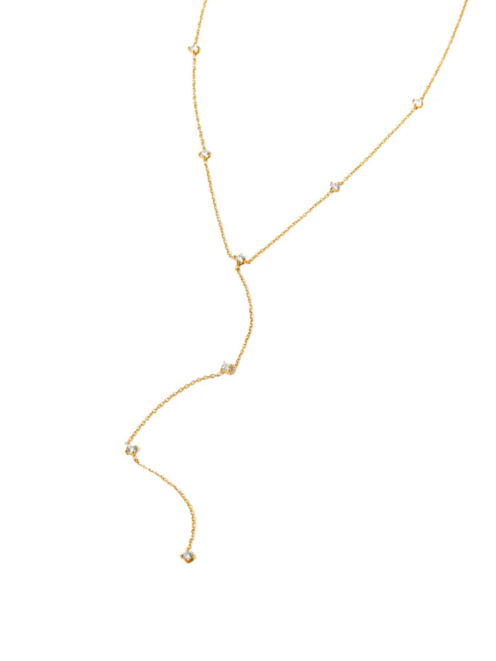Confeccionado em Aço Inoxidável com um luxuoso banho de Ouro 18K, o colar garante durabilidade excepcional, resistência à água e o brilho intenso do dourado. O destaque fica por conta do seu formato Gravata (Lariat), onde a corrente se divide, criando uma cascata de zircônias cintilantes em bezel (lapidação que as emoldura completamente) que descem graciosamente pelo colo.