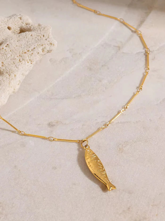 Confeccionado em Aço Inoxidável com um luxuoso banho de Ouro 18K, o colar garante durabilidade excepcional, resistência à água e o brilho intenso do dourado. O destaque fica por conta do seu design de corrente station, composta por pequenos bastões e elos. O charme central é um elegante pingente de peixe com uma delicada gravação, que em muitas culturas é um amuleto de boa sorte, riqueza e fertilidade.