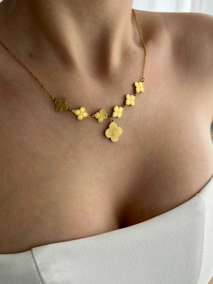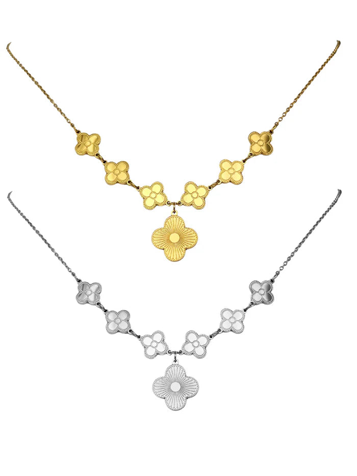 Confeccionado em Aço Inoxidável com opções de acabamento em luxuoso banho de Ouro 18K ou elegante prata polida, o colar garante durabilidade excepcional, resistência à água e um brilho intenso. Seu design único em formato de riviera destaca-se por uma sequência contínua de motivos de trevo de quatro folhas interligados, que criam um delicado decote em V.
