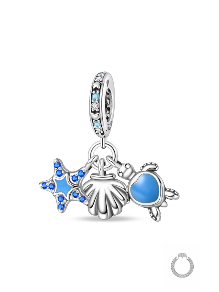Feito em Prata 925 autêntica, este berloque pendente é um convite para o mundo subaquático. Ele traz três tesouros do mar: uma estrela do mar cravejada com gemas azuis, uma concha elegante e uma tartaruga adorável com um casco em formato de coração.