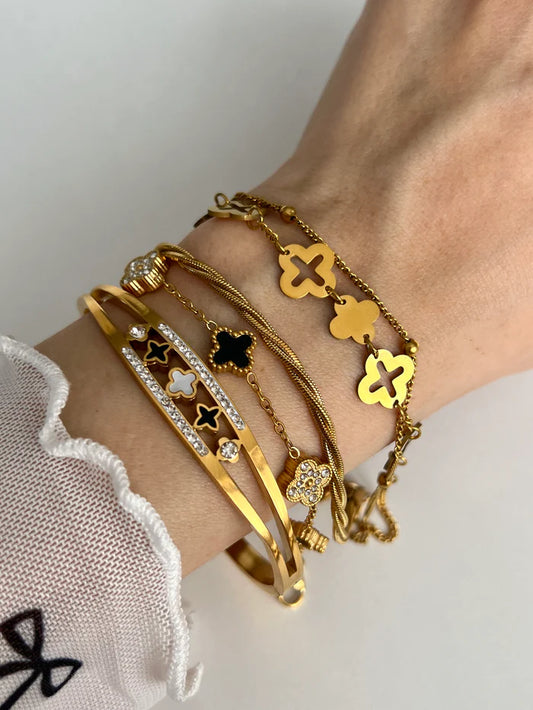 Confeccionada em Aço Inoxidável com um luxuoso banho de Ouro 18K, a pulseira garante durabilidade excepcional, resistência à água e o brilho intenso do dourado. Seu design é moderno e elegante, com o aro semirrígido liso e polido. O destaque fica por conta do trevo de quatro folhas central, preenchido com ônix preto e emoldurado por um delicado detalhe em bolinhas. Pequenas esferas douradas nas laterais e a corrente extensora finalizam o visual com discrição e sofisticação.