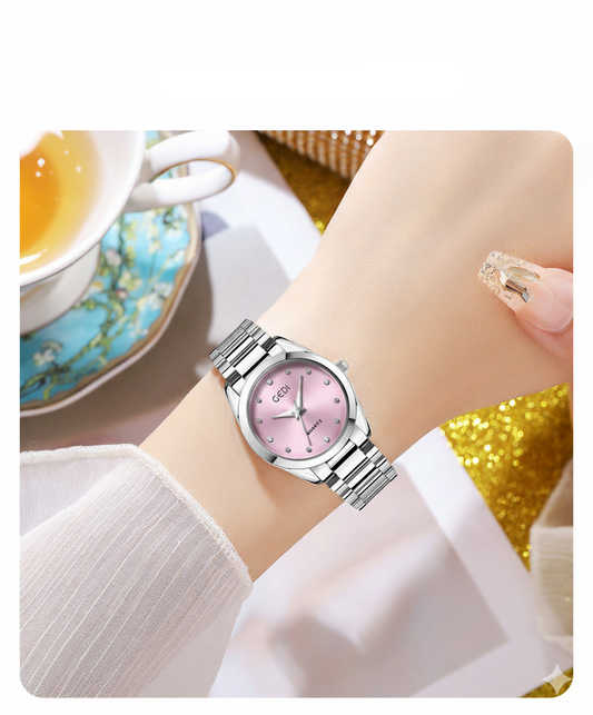 Seu design minimalista com caixa redonda e mostrador clean evoca um estilo retrô e elegante. Pequeno e discreto, este relógio de quartzo é o acessório ideal para qualquer ocasião, do casual ao formal. A pulseira em aço oferece um toque de estilo e durabilidade. Além de tudo, ele é à prova d'água, combinando beleza e praticidade.