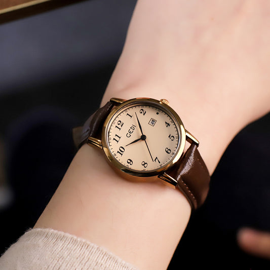 Seu design minimalista com caixa redonda e mostrador clean evoca um estilo retrô e elegante. Pequeno e discreto, este relógio de quartzo é o acessório ideal para qualquer ocasião, do casual ao formal. A variedade de cores da pulseira em couro permite que você personalize seu look e adicione um toque de elegância à sua rotina. Além de tudo, ele é à prova d'água, combinando beleza e praticidade.