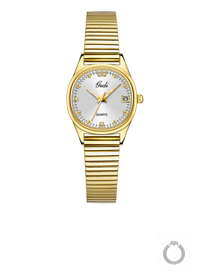 Seu design atemporal com caixa redonda e mostrador em cores neutras e vibrantes, junto aos marcadores de brilho, evoca um estilo sofisticado. O diferencial fica por conta da pulseira expansível, que se ajusta perfeitamente ao pulso sem a necessidade de fechos, combinando beleza e funcionalidade. Além de tudo, ele é um relógio de quartzo com calendário, garantindo precisão e conveniência.