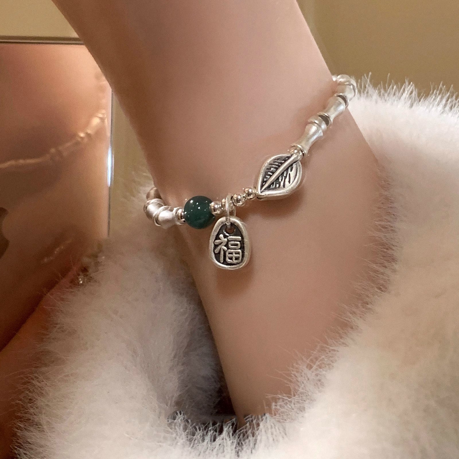 Confeccionada em Prata 925 legítima, a pulseira é hipoalergênica e garante brilho e durabilidade. O destaque fica por conta do design de contas de bambu que criam um visual orgânico e sofisticado. O charm pendente de folha simboliza a renovação, enquanto a pedra verde natural central (ágata ou jade) representa a vitalidade e a sorte. O pequeno charm com o ideograma chinês de "Fortuna" (福) sela a peça com um poderoso significado de prosperidade.