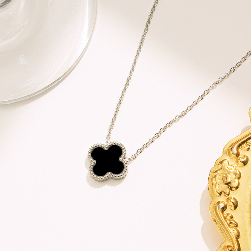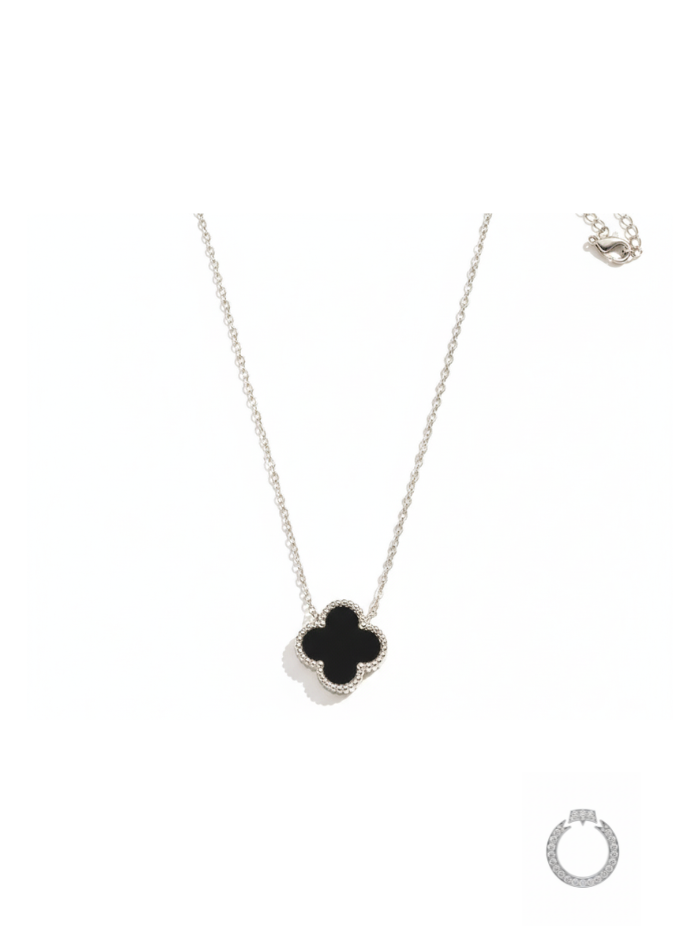 O destaque é o pingente solitário de trevo de quatro folhas, preenchido com uma resina ou material na cor intensa (como ônix), que simboliza elegância e força. A moldura do trevo, detalhada com as delicadas bolinhas (beaded edge), reforça o visual clássico e luxuoso da joia.