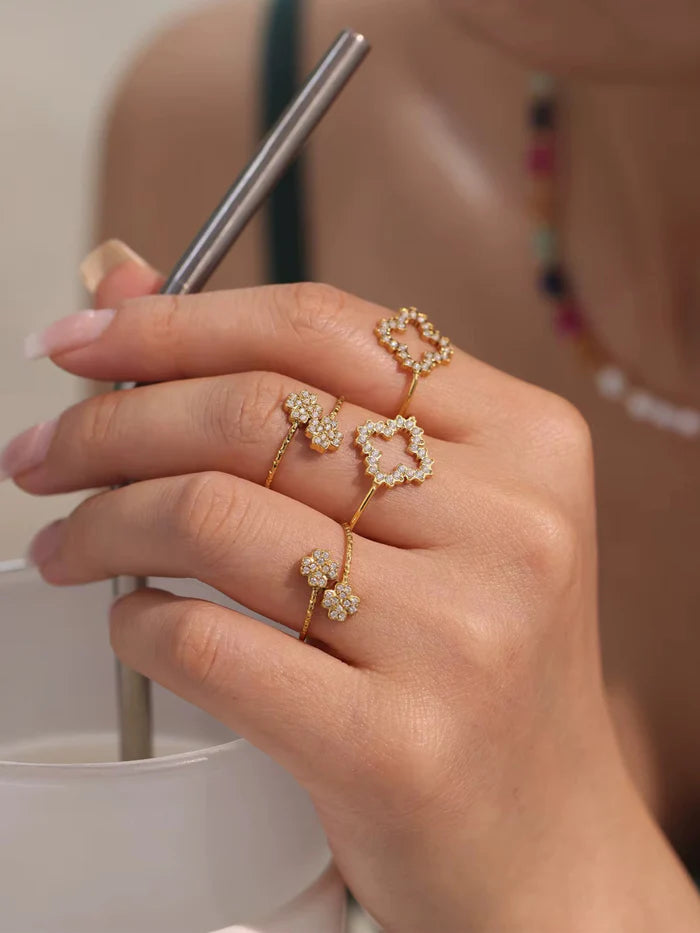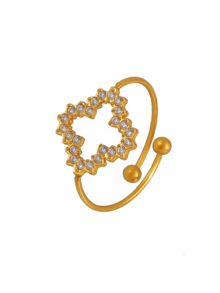 Confeccionado em Aço Inoxidável com um luxuoso banho de Ouro 18K, o anel garante durabilidade excepcional, resistência à água e o brilho intenso do dourado. O destaque fica por conta do seu design ajustável e aberto, onde um coração vazado é inteiramente cravejado com zircônias cintilantes. As extremidades do aro são finalizadas com esferas polidas, adicionando um toque minimalista e elegante.