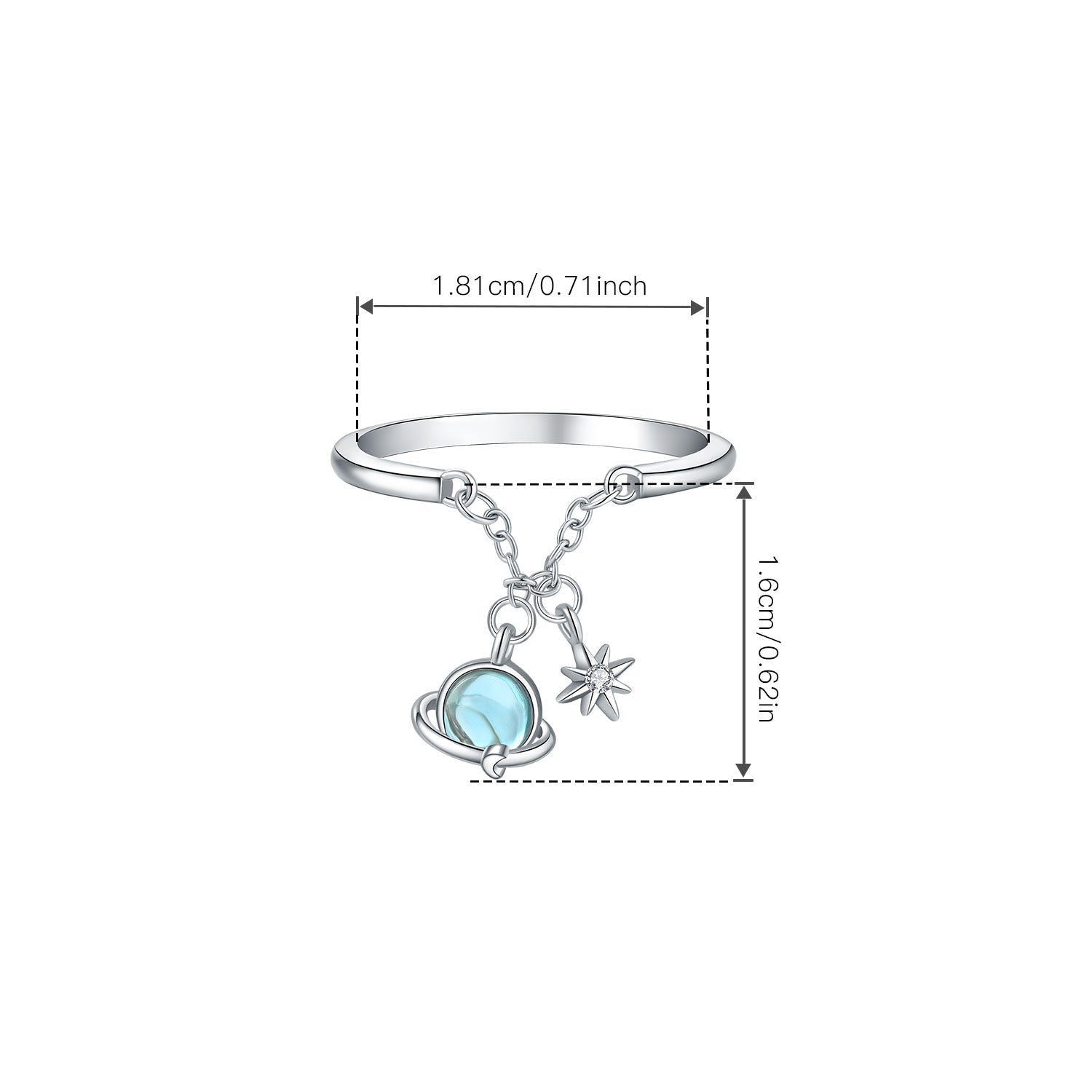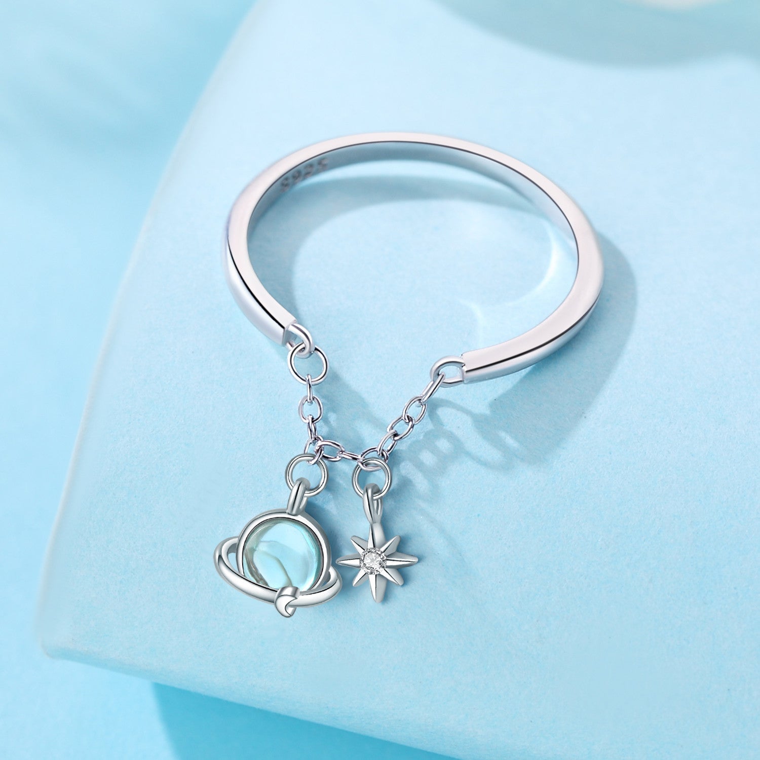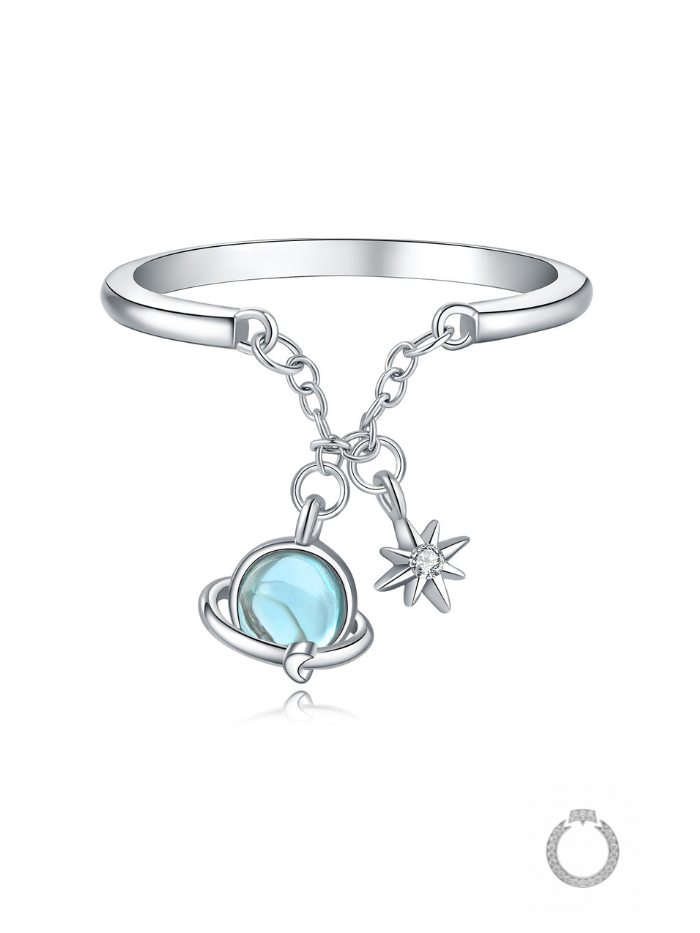 Detalhes: Anel ajustável com pingente de planeta e estrela, suspensos por corrente.