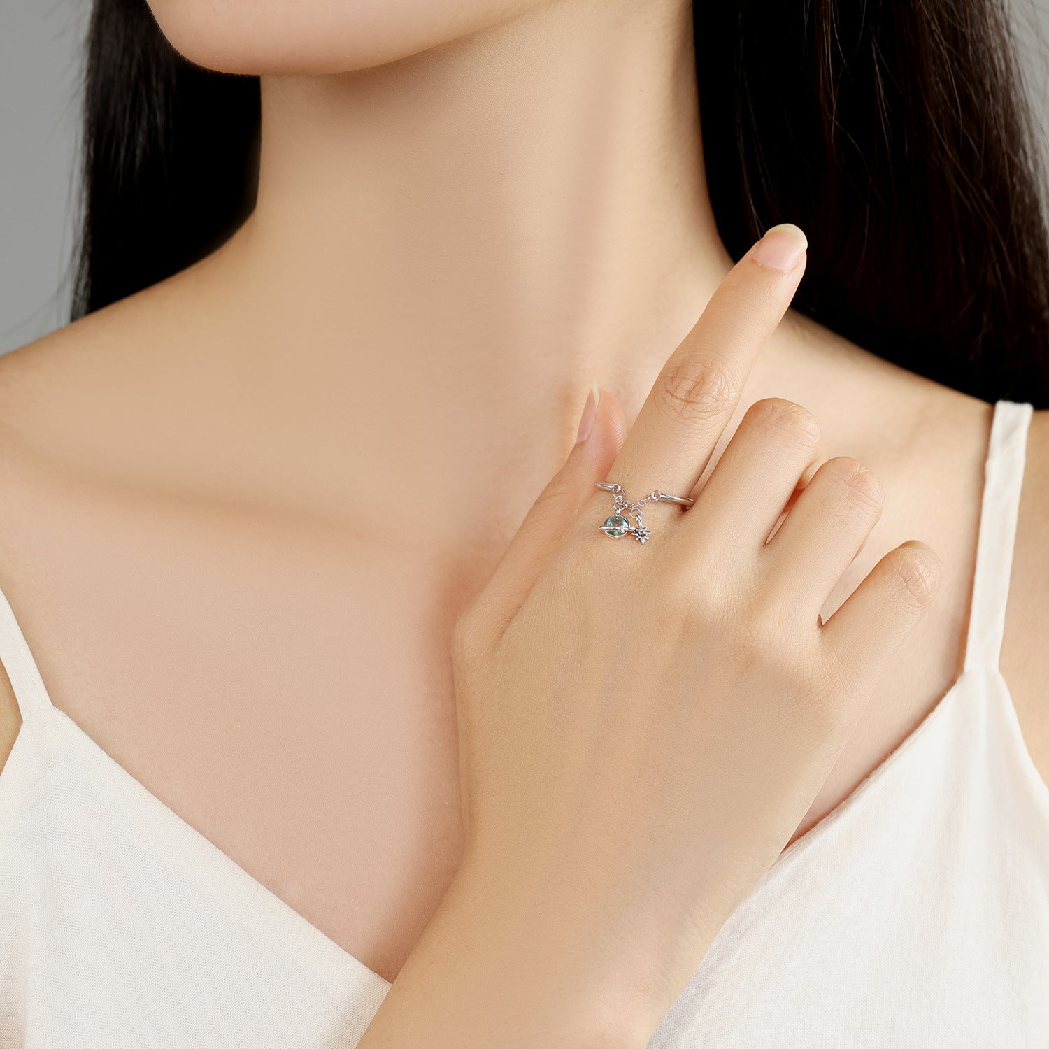 Um planeta estilizado com um cristal azul-claro central e um anel orbitante, simulando uma pequena galáxia no seu dedo.
