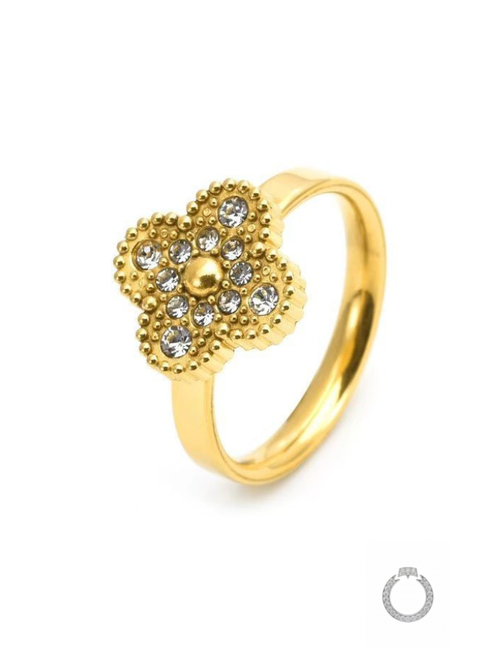 Confeccionado em Aço Inoxidável com um luxuoso banho de Ouro 18K, o anel garante durabilidade excepcional, resistência à água e o brilho intenso do dourado. O destaque fica por conta do design em formato de trevo de quatro folhas, com um centro ricamente adornado por zircônias cintilantes em diferentes tamanhos. A moldura em bolinhas (beaded edge) adiciona uma textura sofisticada e um charme único à peça.